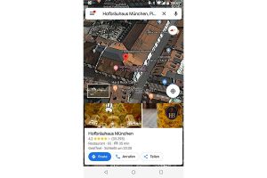 Wer Google Maps am Rechner nutzt, kann auf deutlich mehr Funktionen zugreifen und viele Extras nutzen. Das betrifft sowohl die Karten- als auch die Satellitenansicht. Wenn Sie zum Beispiel auf den Doppelpfeil klicken, der rechts in der unteren Ecke platziert ist, wird am unteren Bildschirmrand eine Leiste mit Fotos und – sofern vorhanden – 360-Grad-Panoramen eingeblendet. Klicken Sie eines der Motive an, wird die Aufnahme vergößert angezeigt.